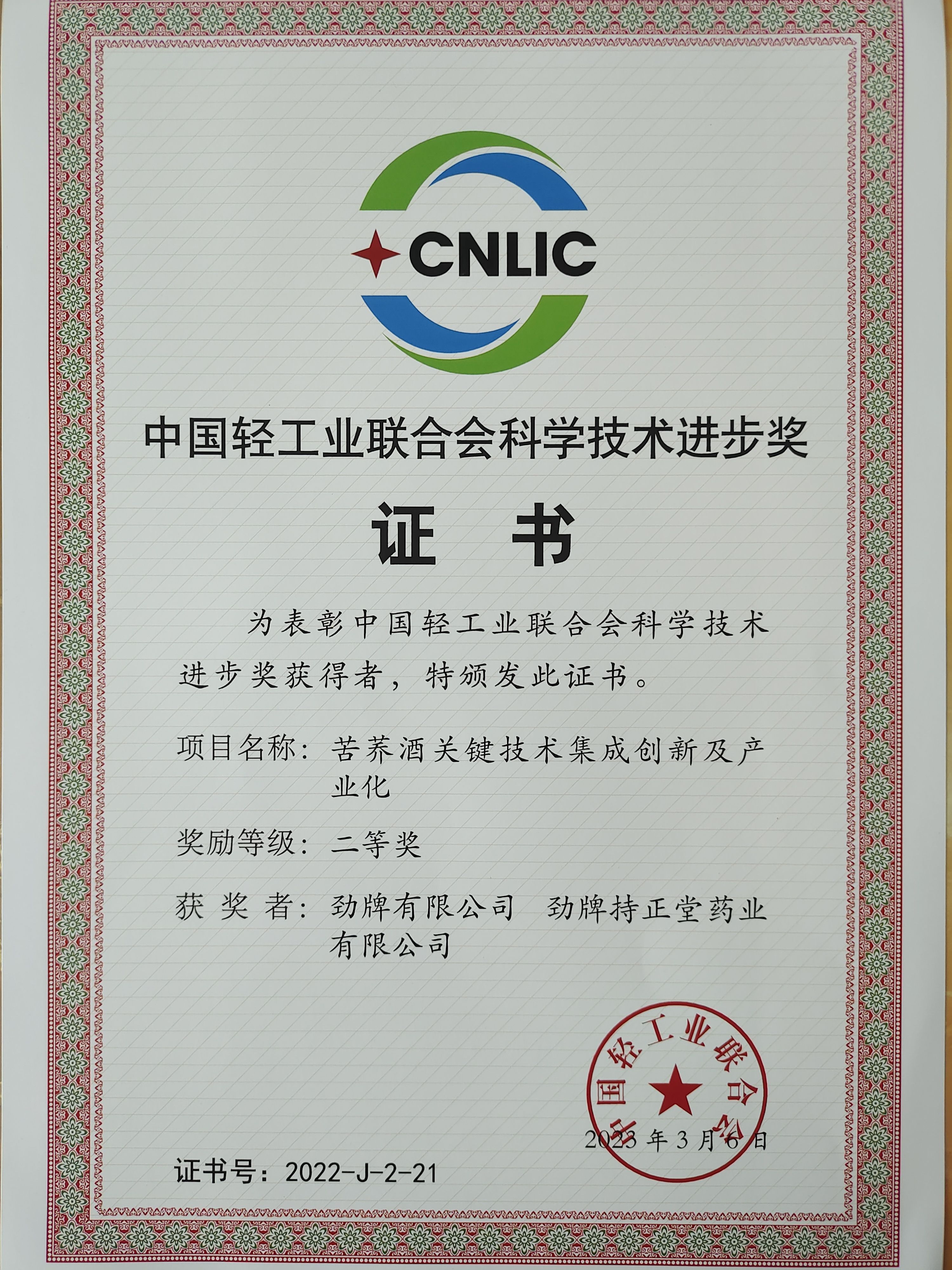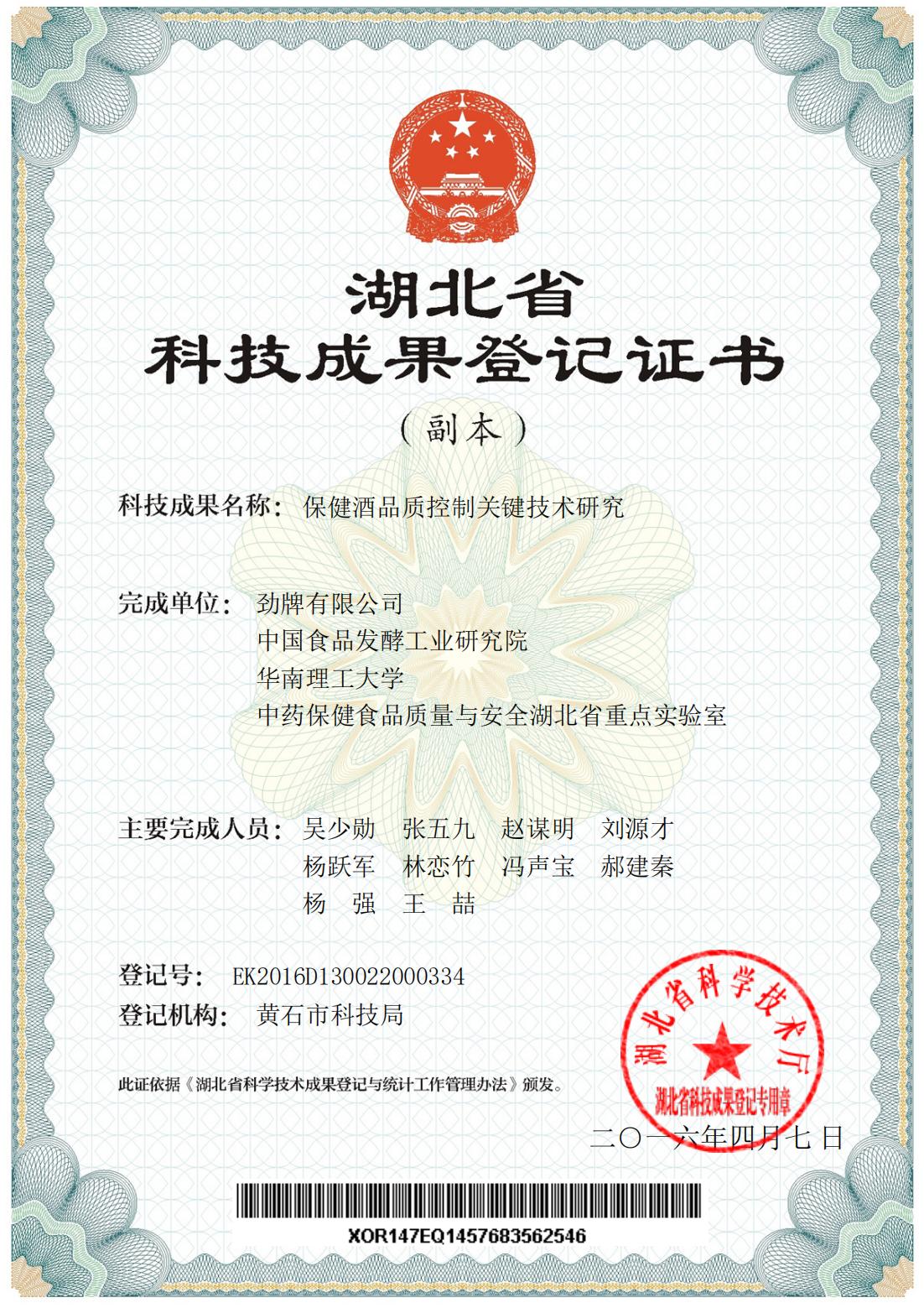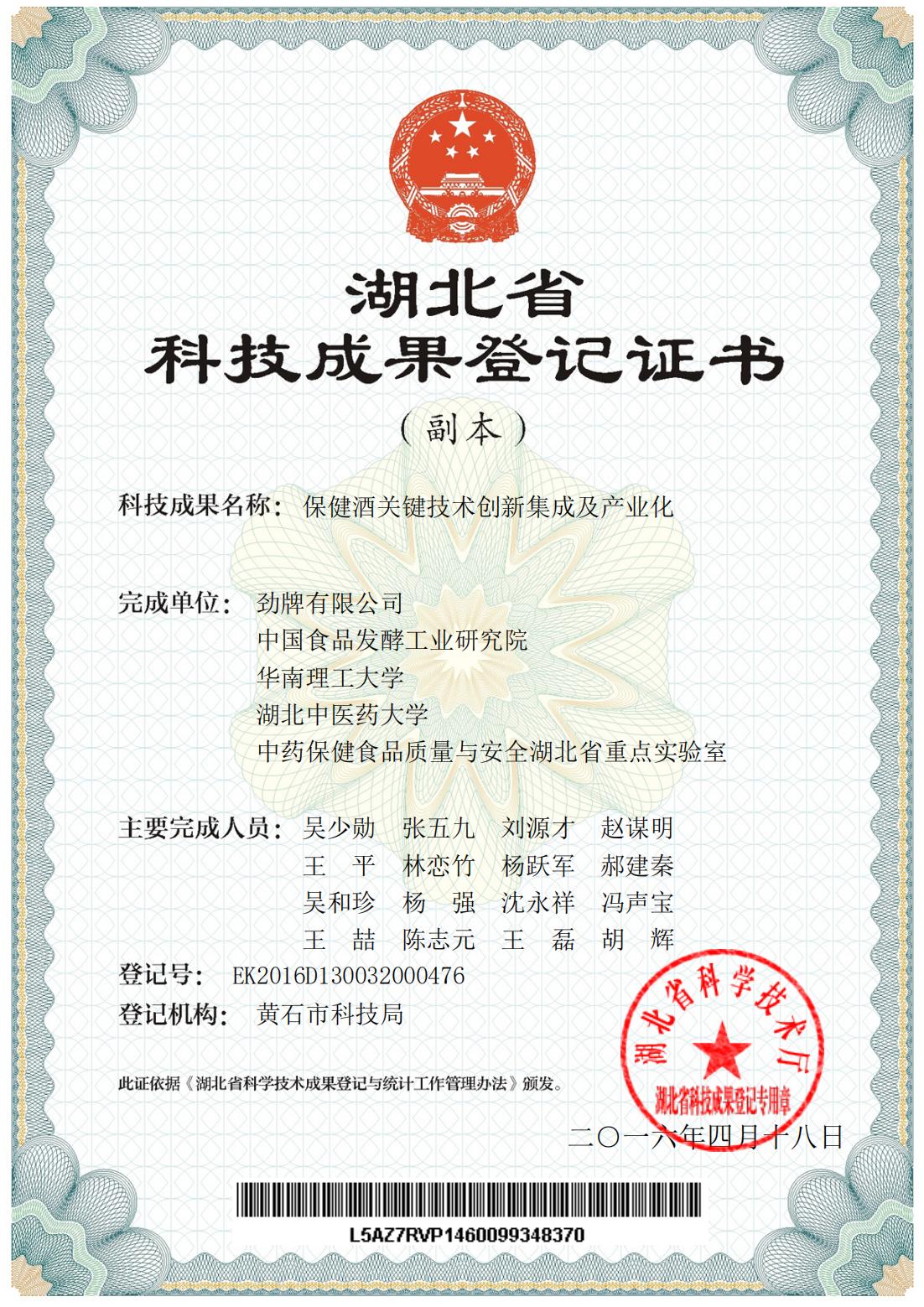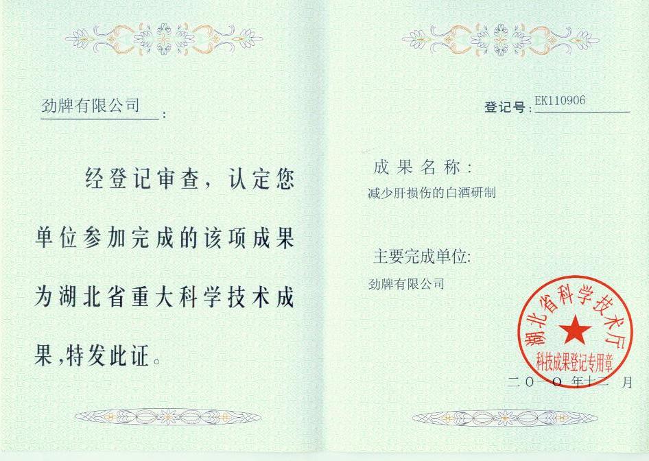 目前勁牌有限公司共獲得國家級、省級、行業級科技獎勵27項。其中國家級科技獎1項,省部級科技獎11項,行業級科技獎15項。