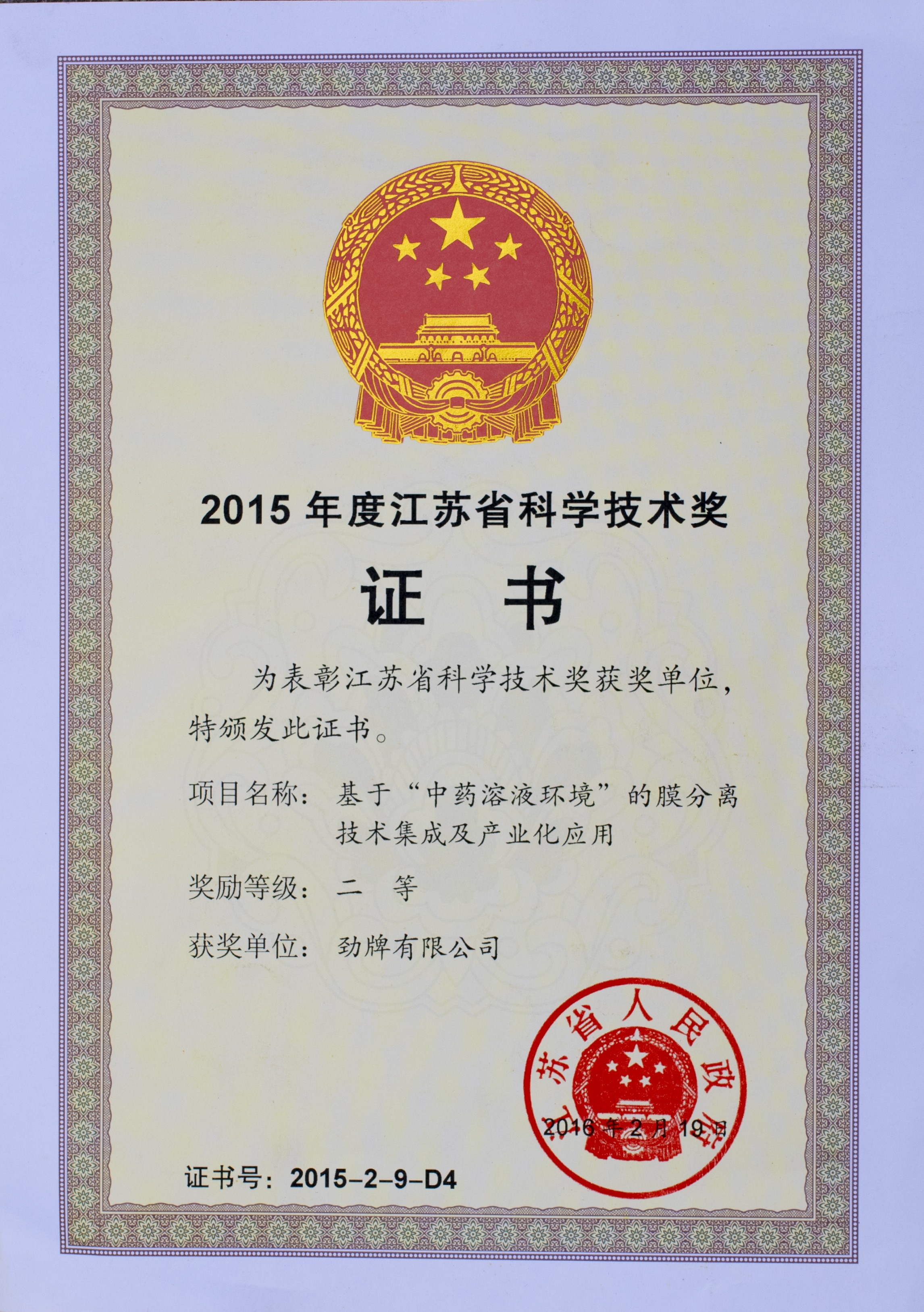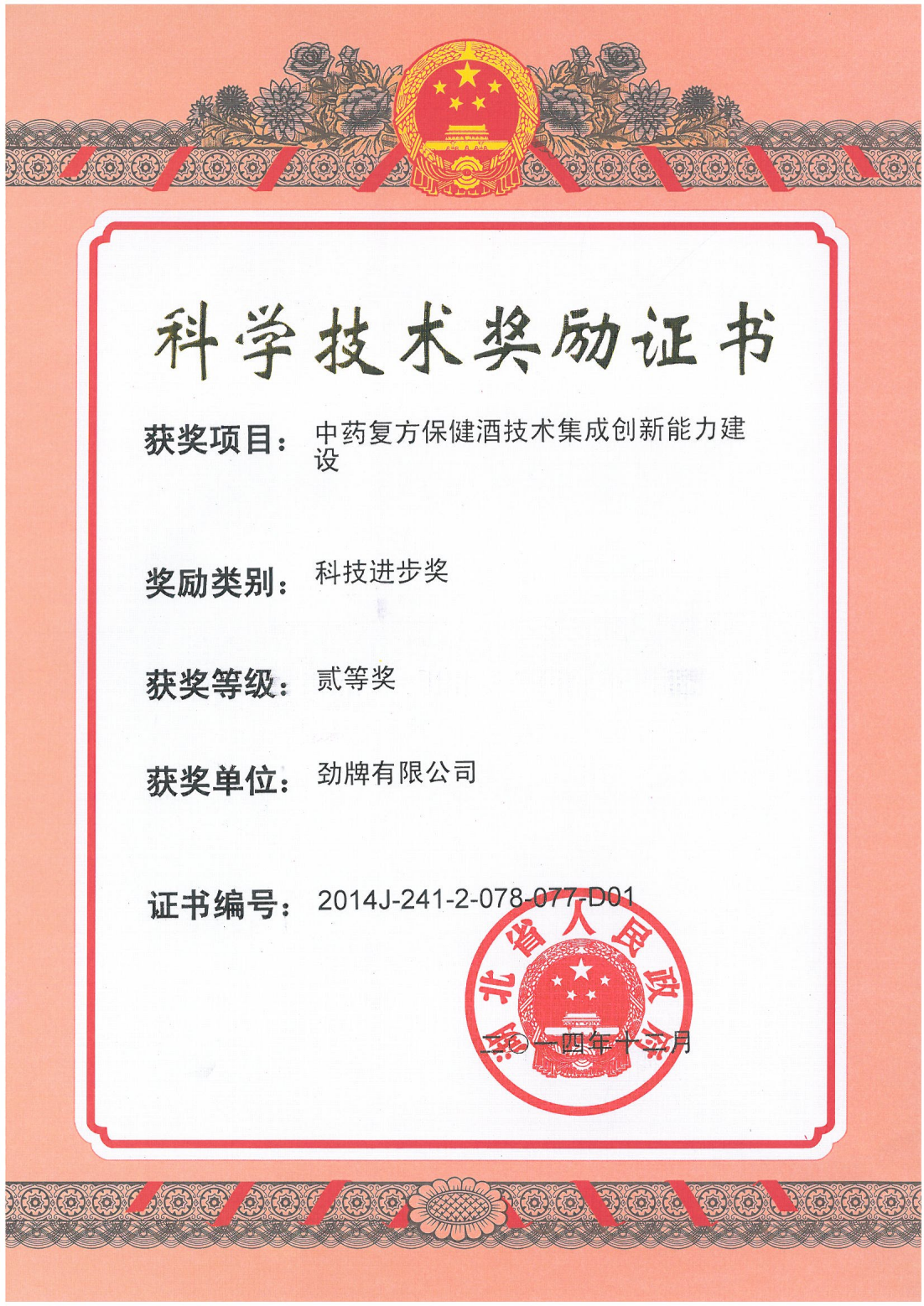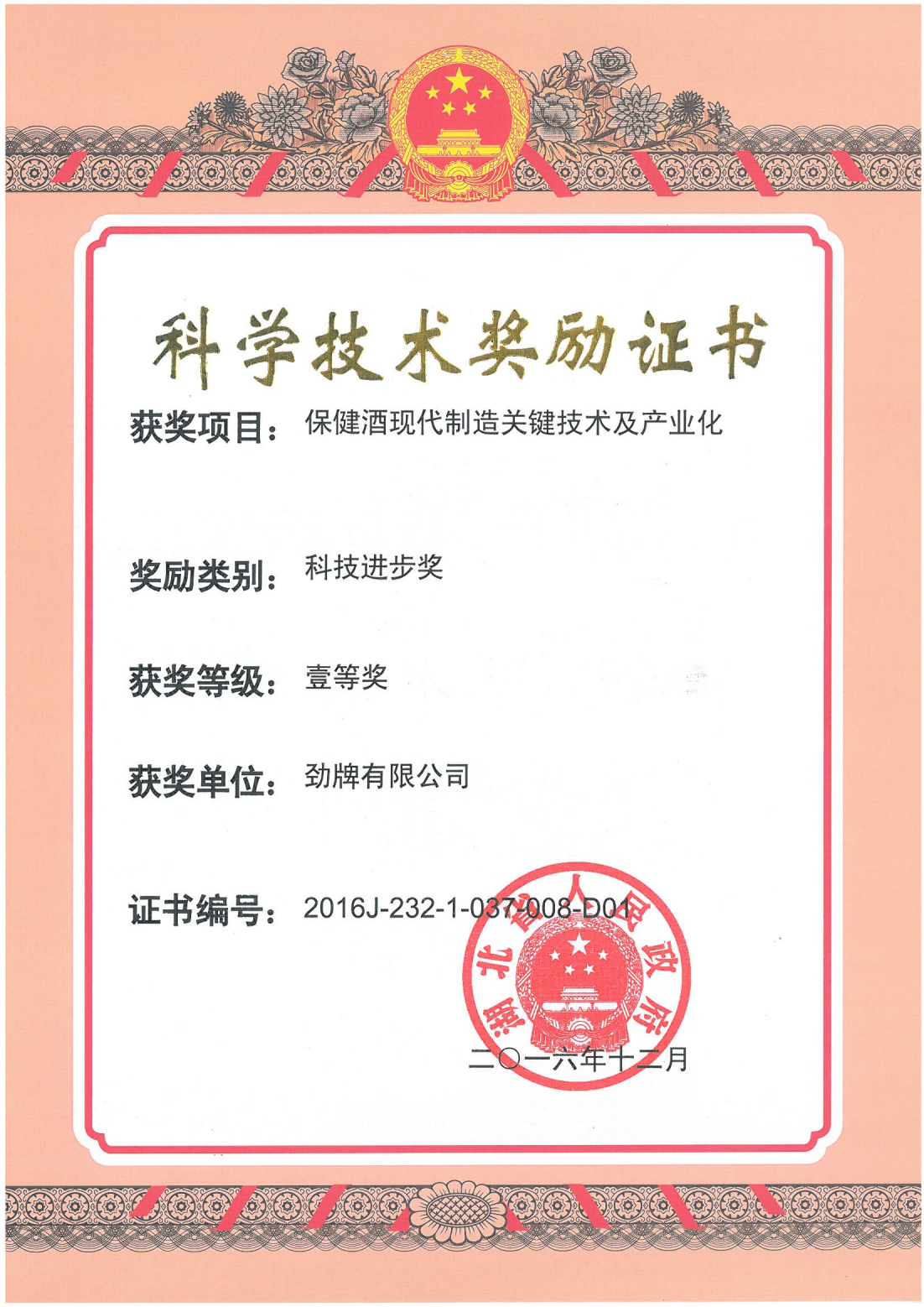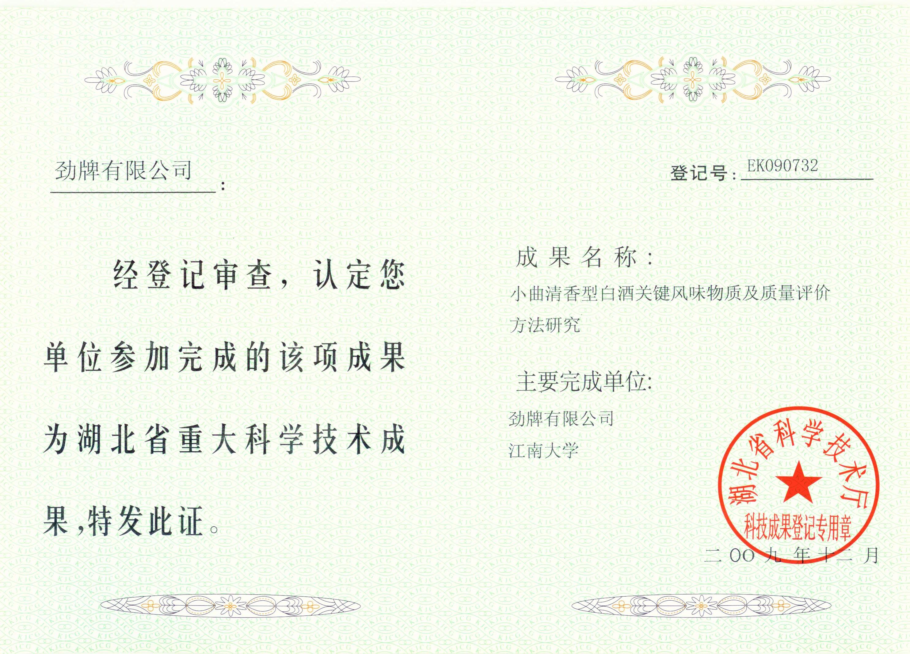 目前勁牌有限公司共獲得國家級、省級、行業級科技獎勵27項。其中國家級科技獎1項,省部級科技獎11項,行業級科技獎15項。